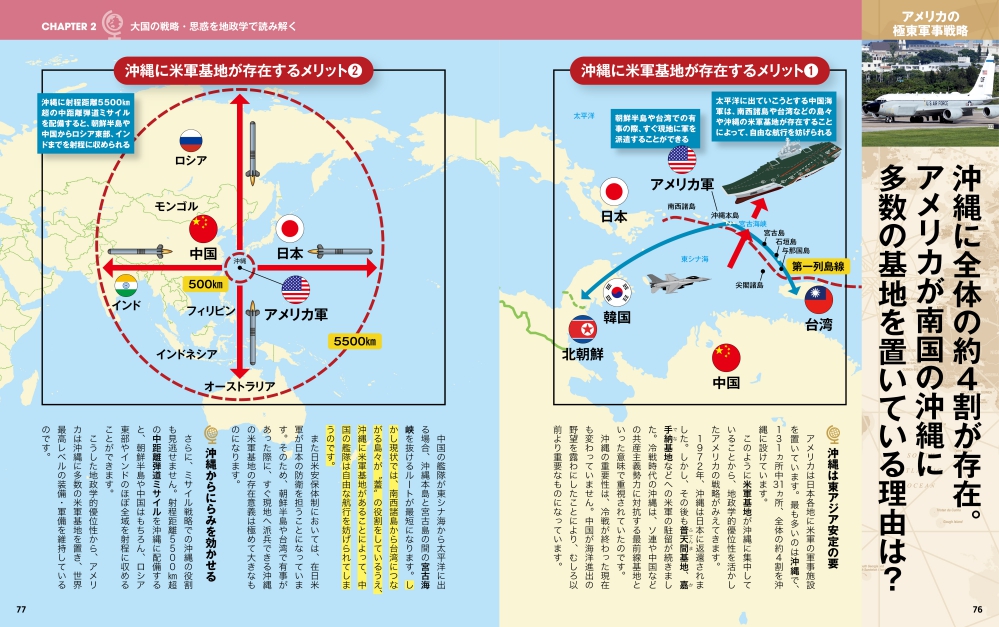 日本各地に点在する米軍の施設、その約4割が沖縄に集中している。冷戦時代、旧ソ連や中国に対抗する最前線基地として機能してきた沖縄は、冷戦終結後、中国の海洋進出に伴い、更にその重要度を増している。太平洋へ向かう中国海軍への牽制、朝鮮半島・台湾有事への備え、ロシア、中国、インドなどへのミサイル戦略上の価値、これら地政学的優位性が米軍にとっての沖縄の存在意義を高めている。