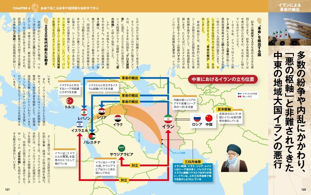 紛争の多発地帯、中東。その多くに絡んでいるのが地域大国イランだ。1979年のイスラム革命のあと、各地にその革命を波及させようと<革命の輸出>を開始。イスラエルと激しく戦うハマスやヒズボラを支援し、同じイスラム教シーア派のシリア・アサド政権を支え、イラク領内のシーア派へも触手を伸ばす。最近ではロシア・中国との協力関係も強化し、「反米枢軸」を固めようとしている。