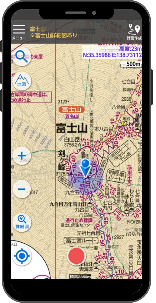 出版物と同じ地図を収録し、GPSでの現在地表示や山行のルート記録のほか、『山と高原地図ホーダイ』では、事前の登山計画を作成する機能を備えております。紙地図と一緒に使い分けることで、より安心安全な登山をお楽しみいただけます。