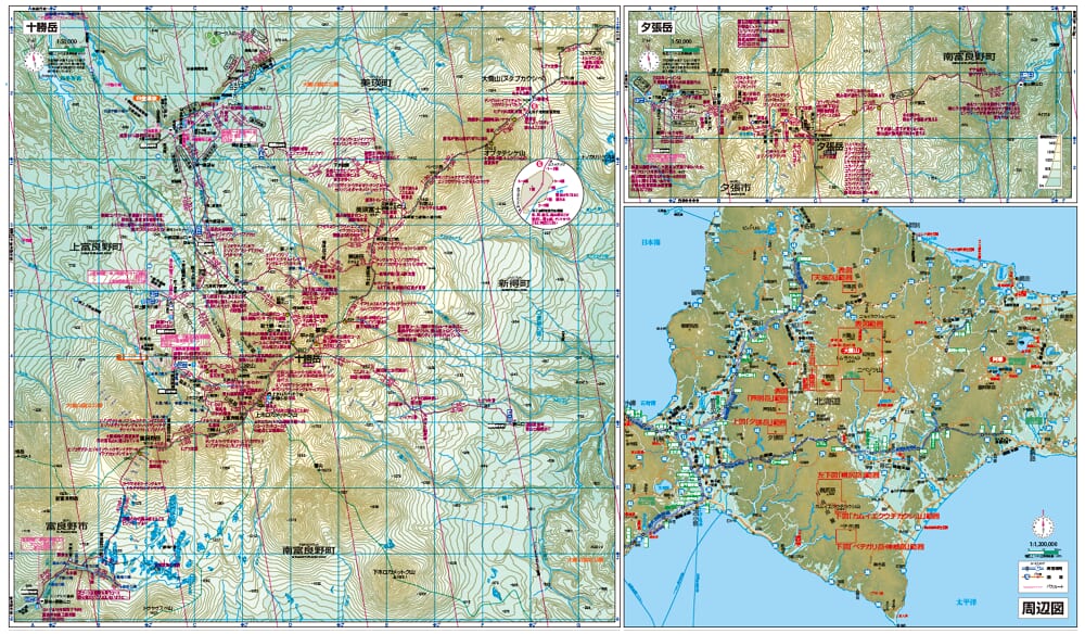 ◆最高峰旭岳を擁する大雪山系から十勝連峰をひと続きに掲載。迷いやすい箇所には拡大詳細図を用意し、登山道の詳細な把握が可能になりました。