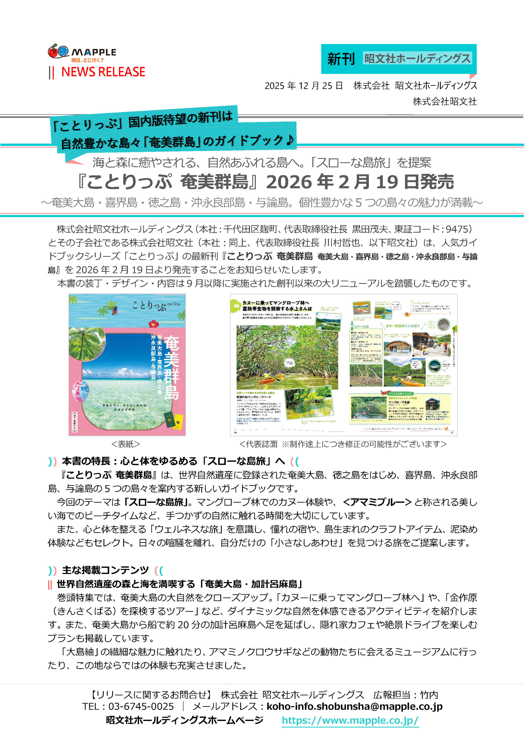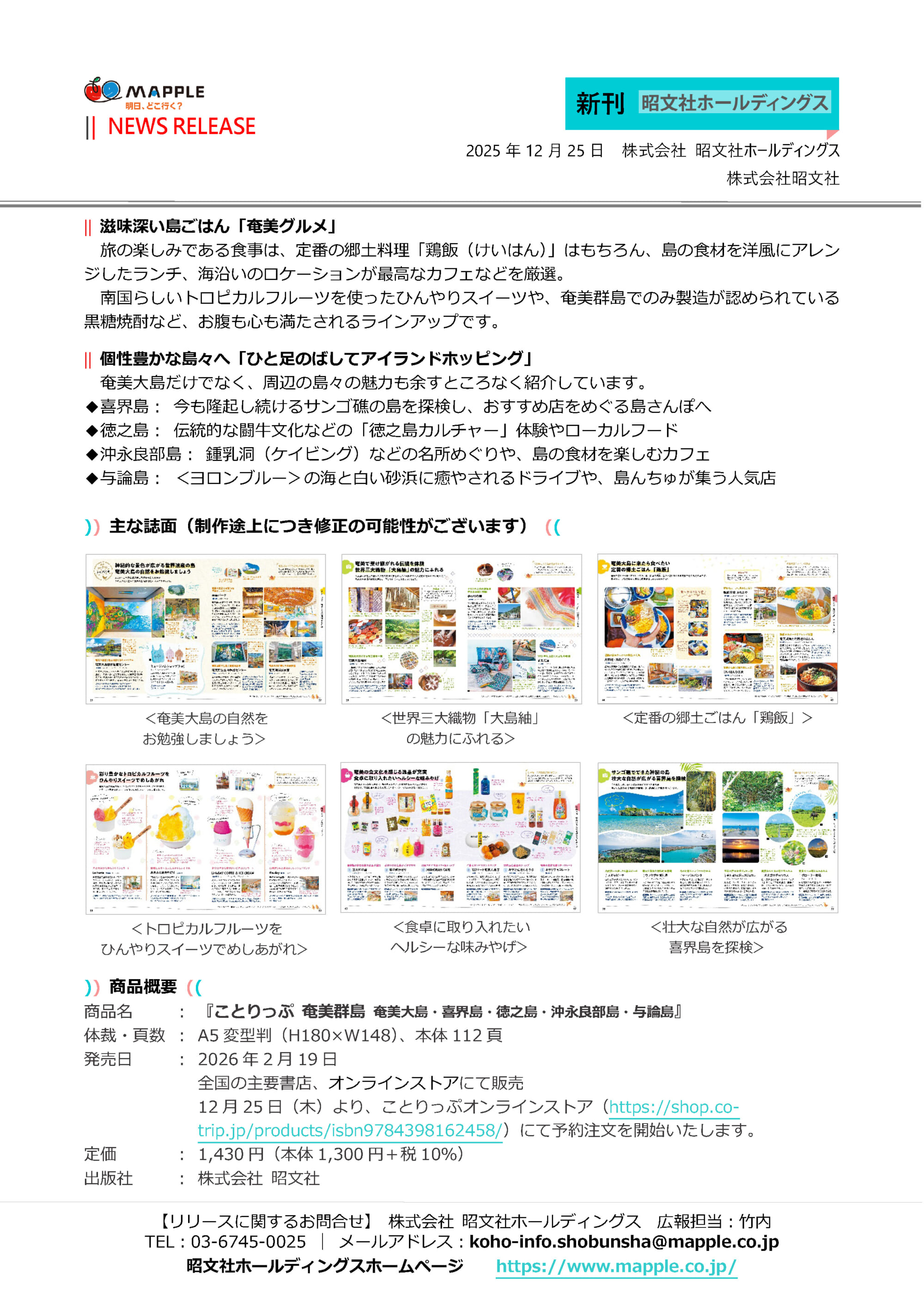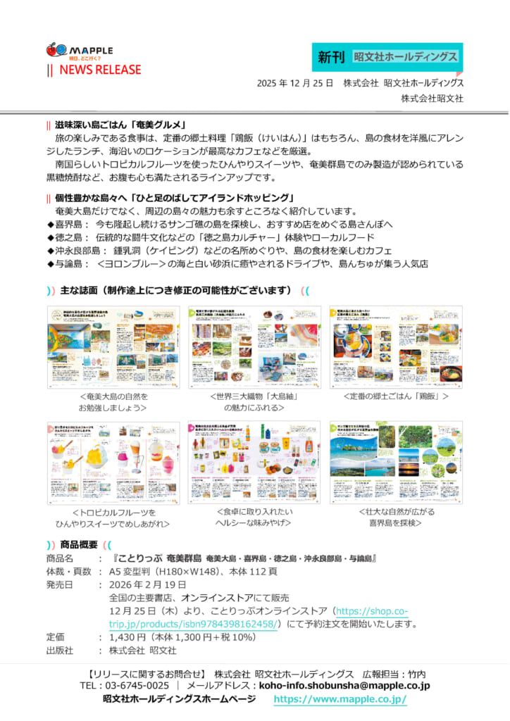 本リリース本文のPDFファイルのご確認・ダウンロードはこちら⇒【リリース】20251225『ことりっぷ奄美群島』発売.pdf