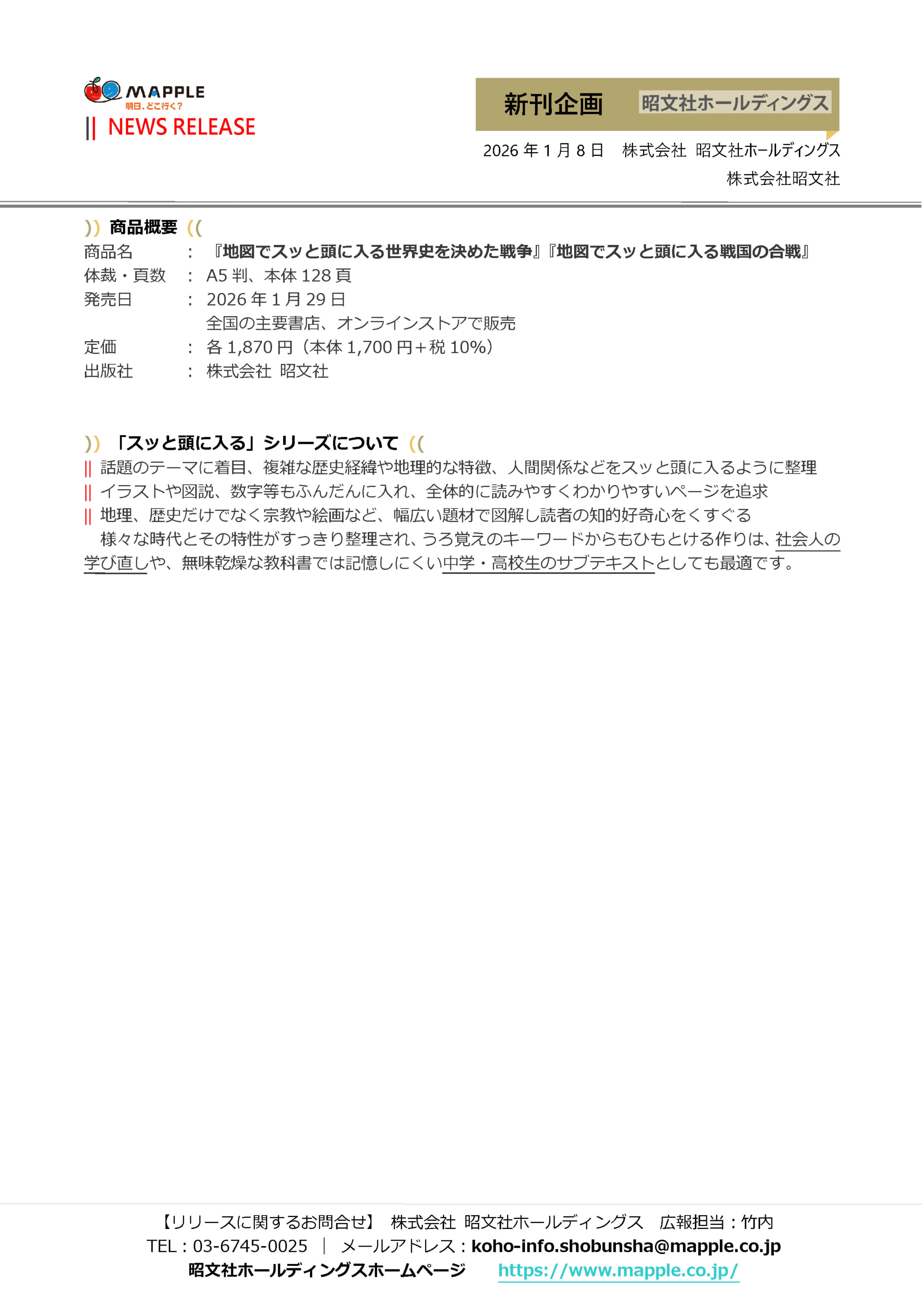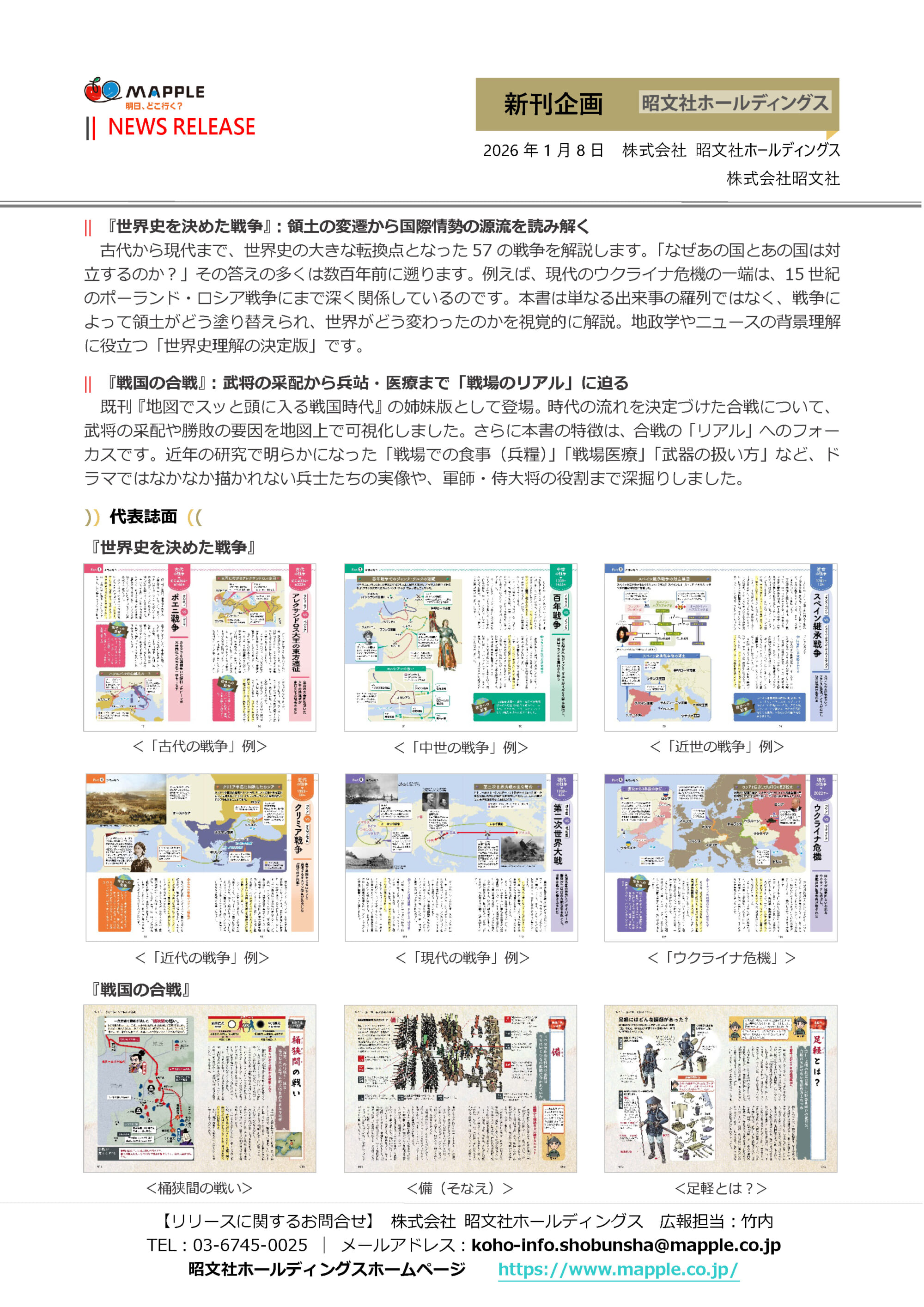 本リリース本文のPDFファイルのご確認・ダウンロードはこちら⇒【リリース】20260108「地図でスッと頭に入る」シリーズ最新刊『世界史を決めた戦争』『戦国の合戦』発売.pdf