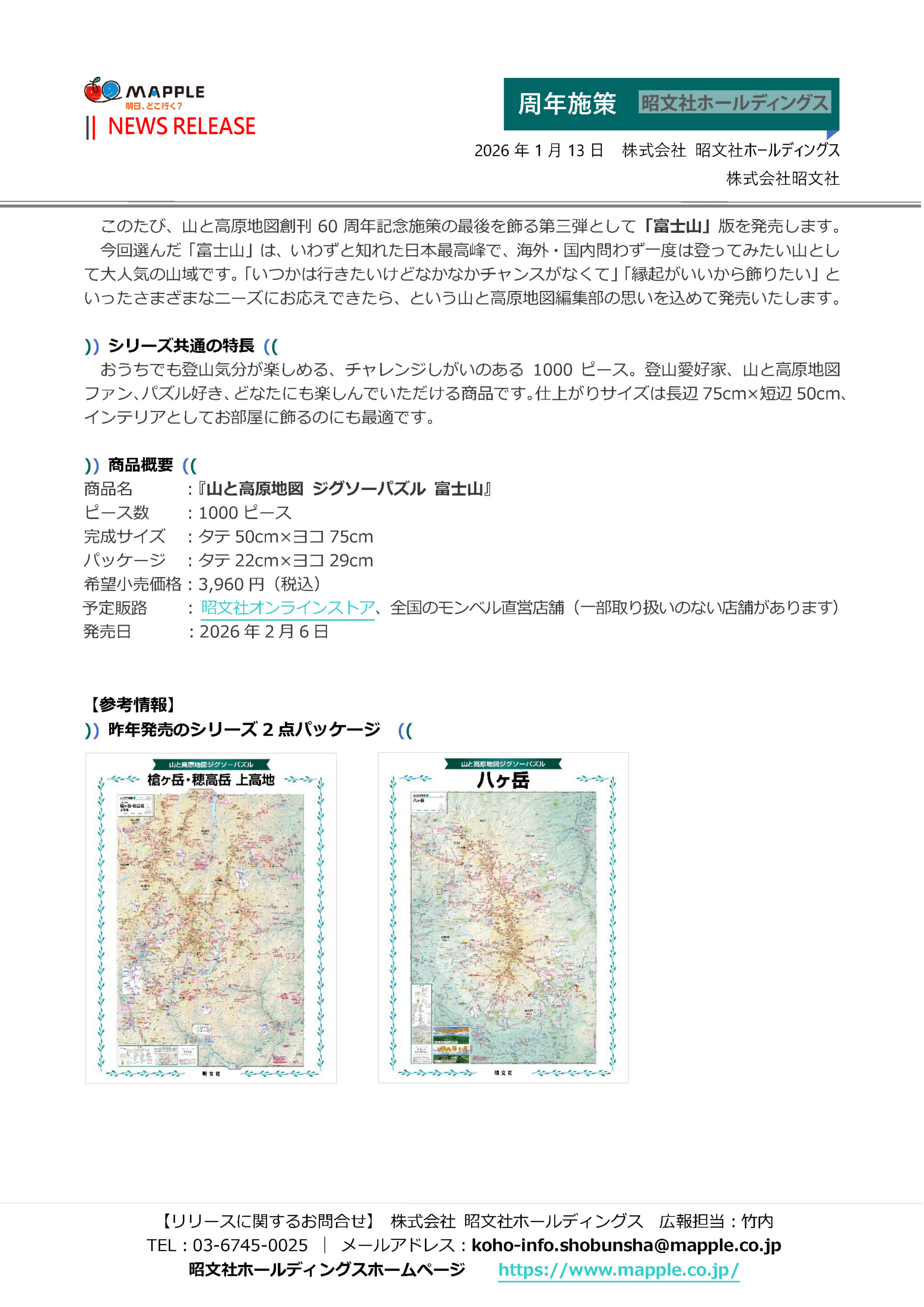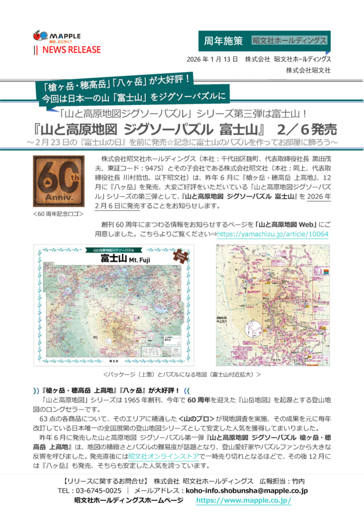 本リリース本文のPDFファイルのご確認・ダウンロードはこちら⇒【リリース】20260113『山と高原地図ジグソーパズル』第三弾「富士山」発売.pdf