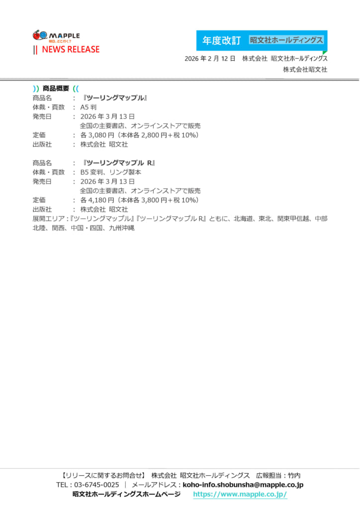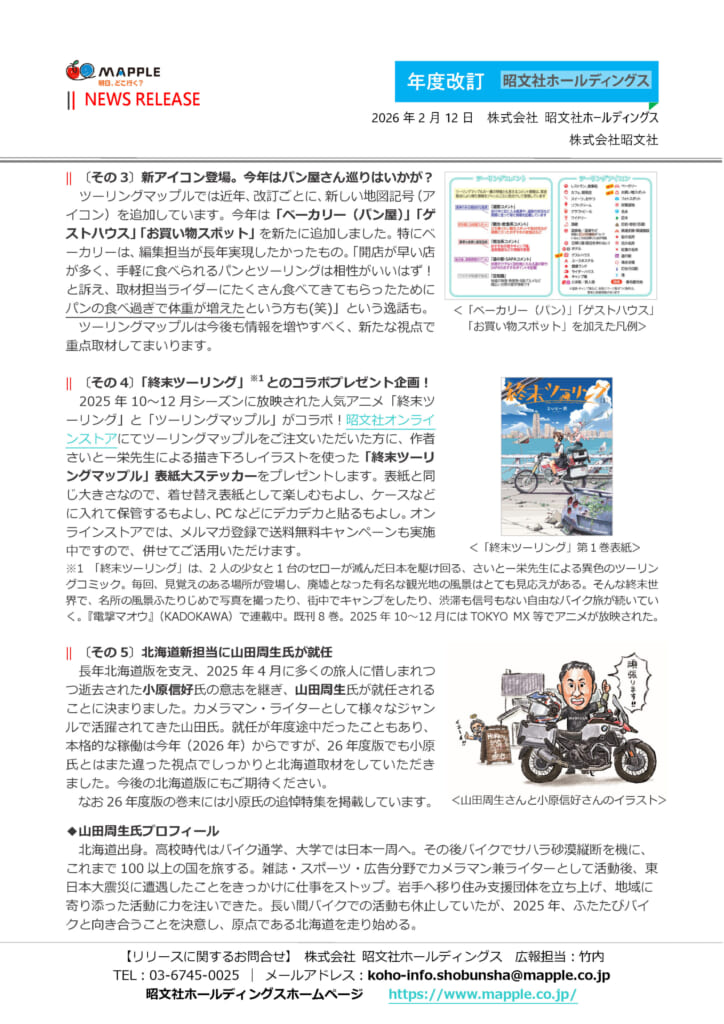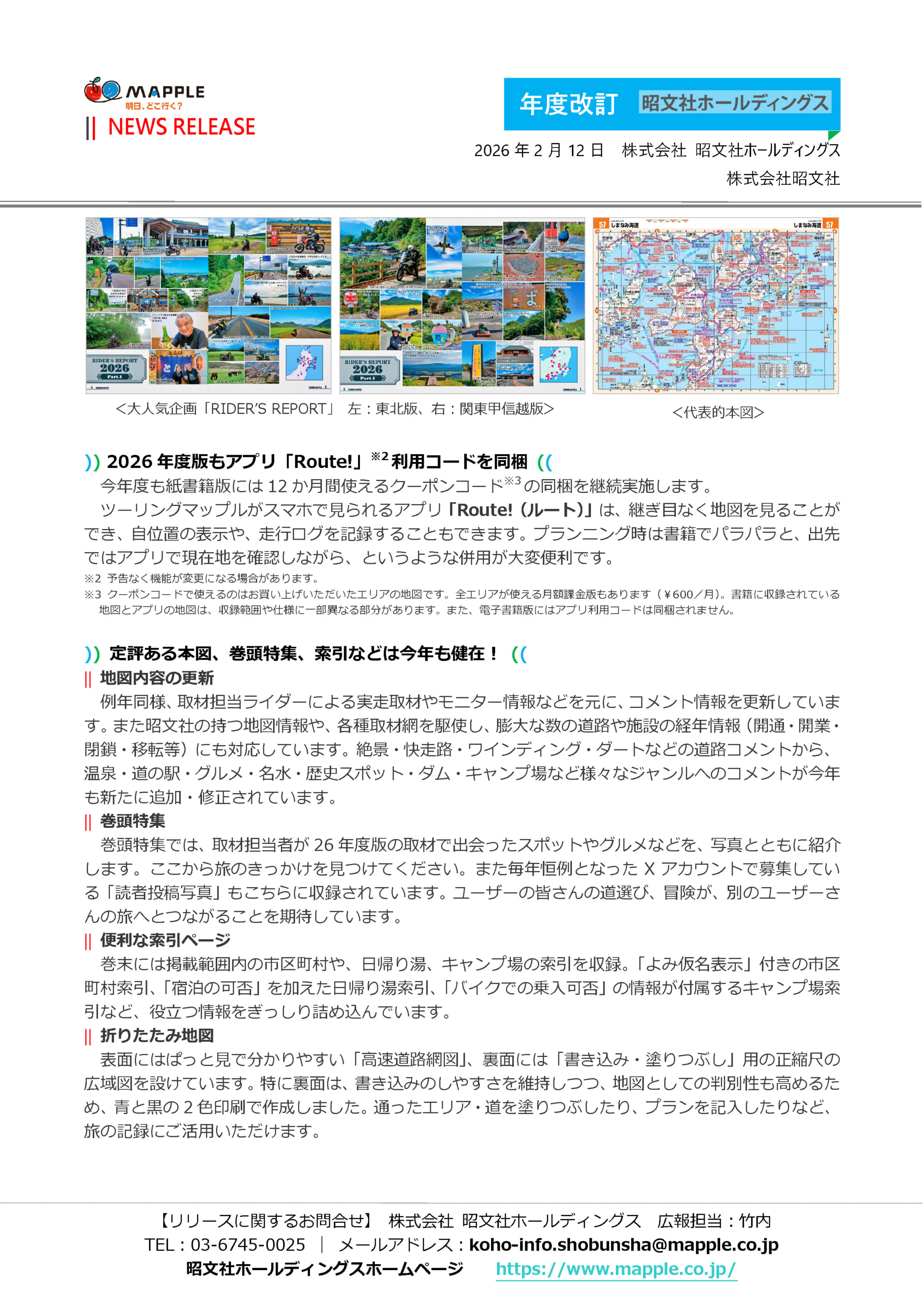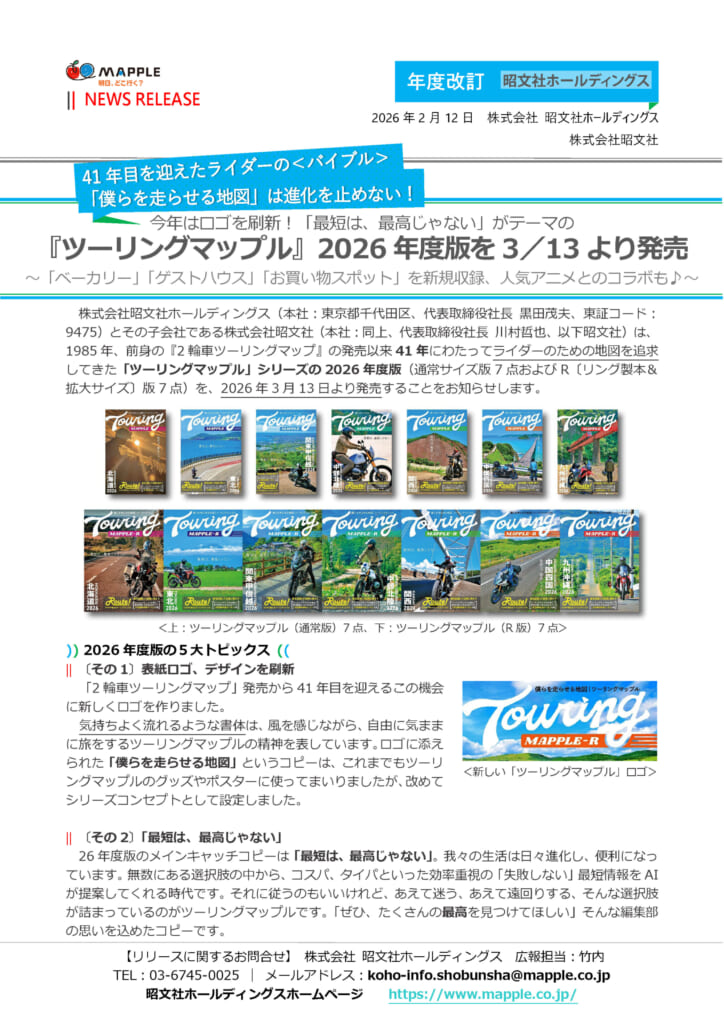 本リリース本文のPDFファイルのご確認・ダウンロードはこちら⇒【リリース】2026212『ツーリングマップル』2026年度版発売.pdf
