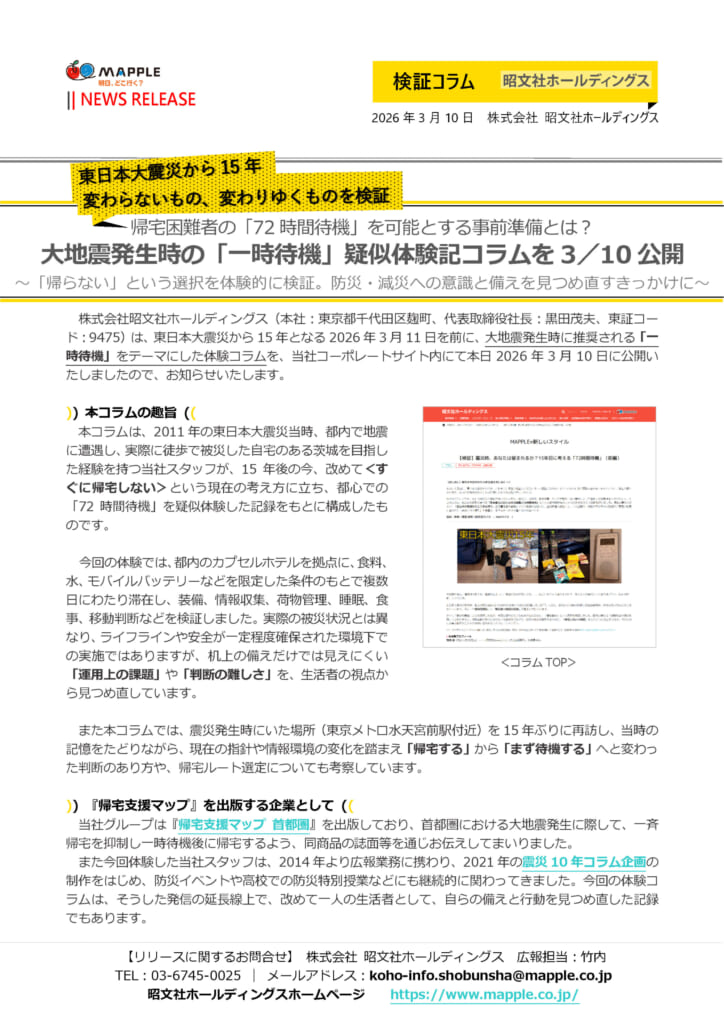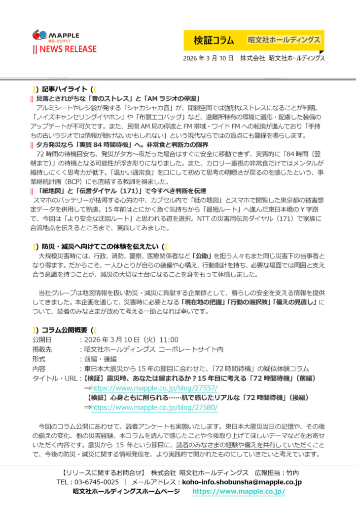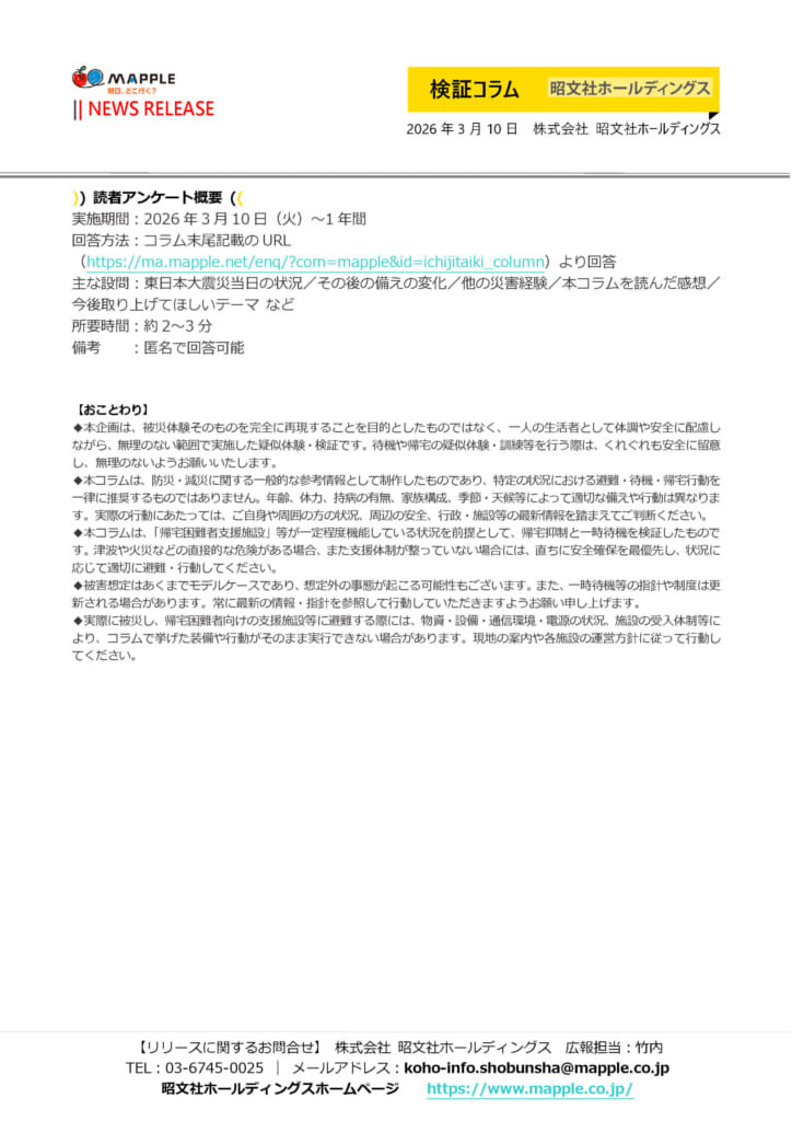 本リリース本文のPDFファイルのご確認・ダウンロードはこちら⇒【リリース】20260310東日本大震災から15年 72時間の一時待機体験を実施.pdf