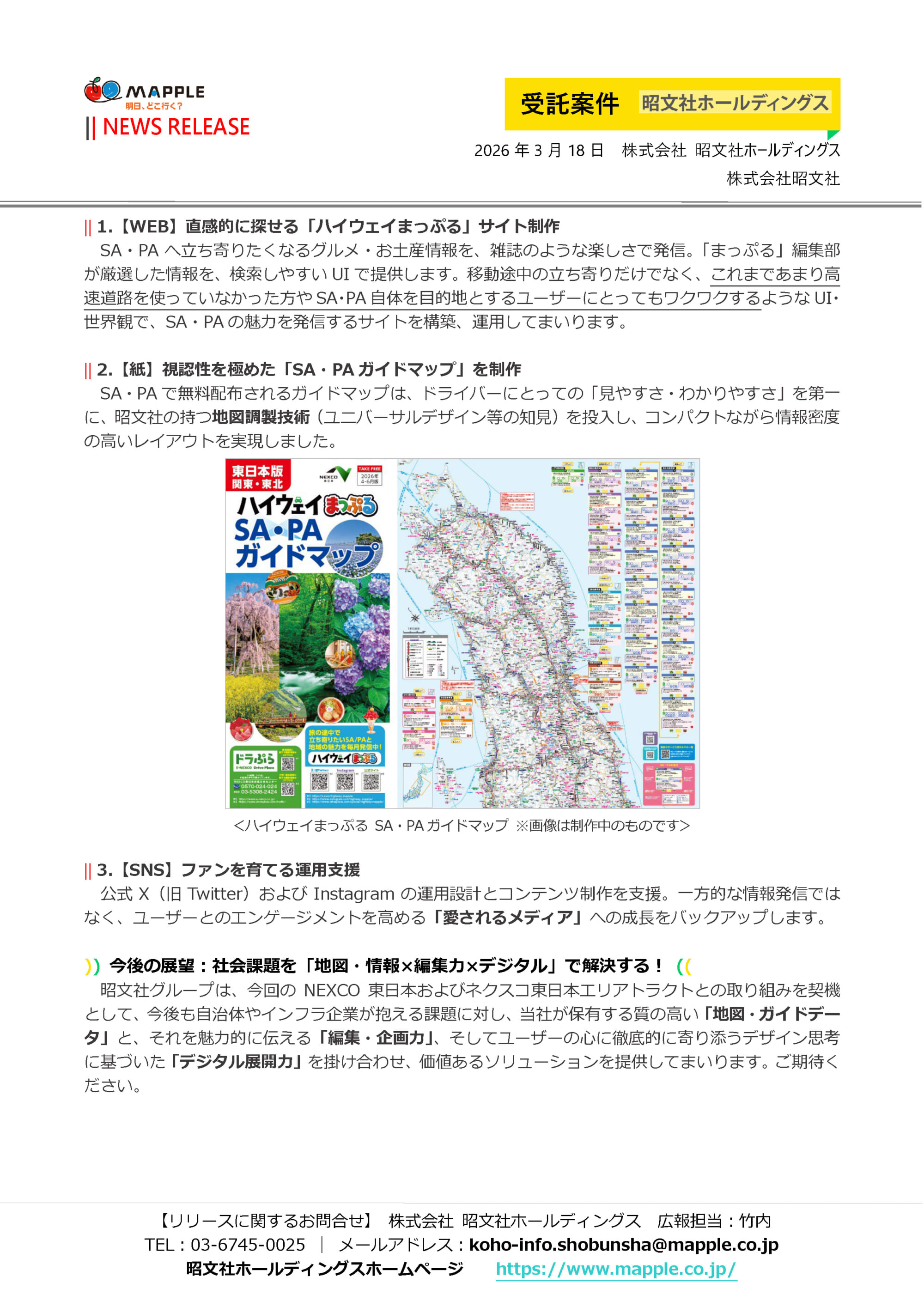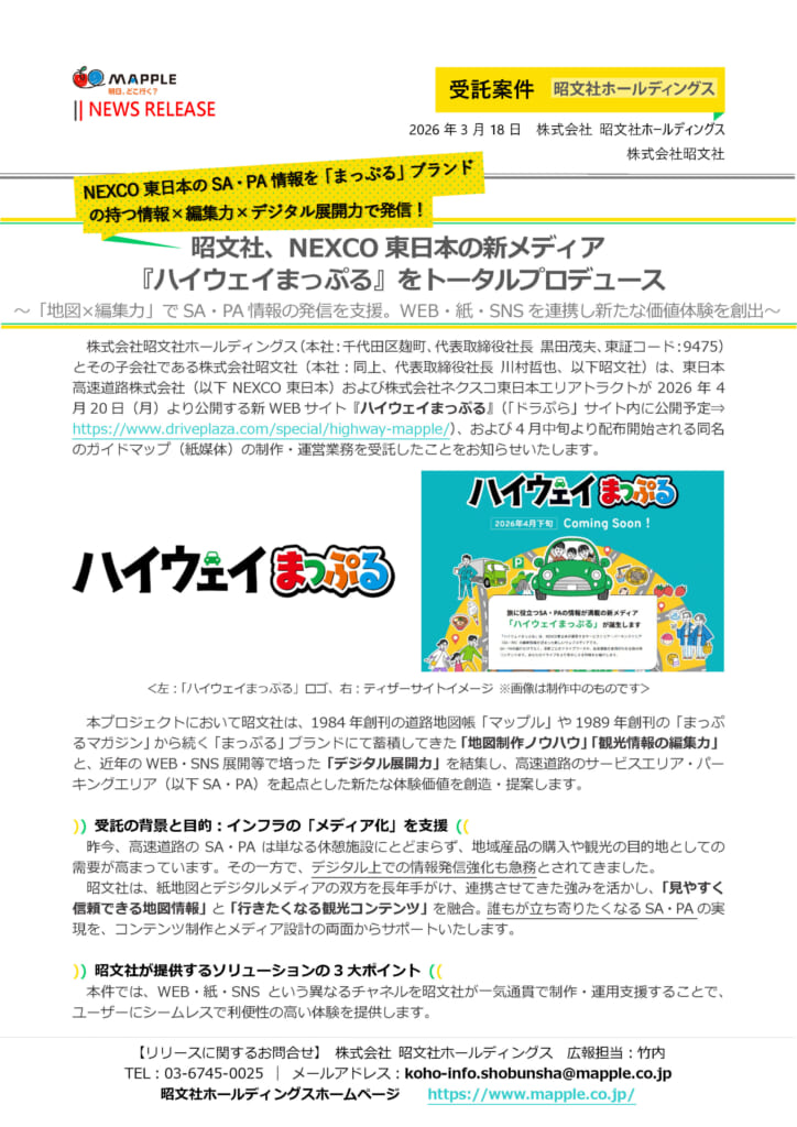 本リリース本文のPDFファイルのご確認・ダウンロードはこちら⇒【リリース】20260318昭文社、NEXCO東日本の新メディア『ハイウェイまっぷる』をトータルプロデュース.pdf