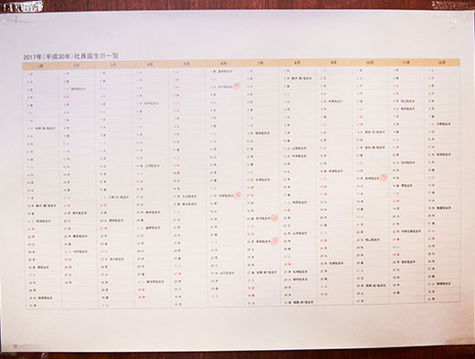 社員の誕生日一覧表! 壁に貼られていて、劇中内で映っているのかもわからない小道具です。お話を聞いてみると