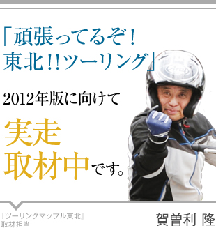 2011年8月27日から「東北縦横無尽計画」と銘打って『ツーリングマップル東北』第二弾の取材を実施。また、震災からちょうど半年過ぎた2011年9月11日(日)から「頑張ってるぞ!東北!!」第5弾がスタート。賀曽利さんの動向はMAPPLEのfacebookでもご紹介していますので、ぜひ、チェックしてみてください。