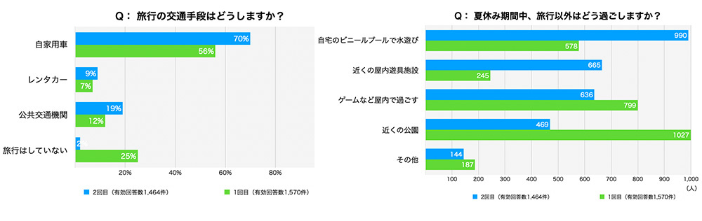 1回目の調査が行われた3月の時点では、予定を立てている家庭のうち、9割以上が泊まりがけでの旅行を予定していましたが、今回「飛行機や新幹線を使って移動する遠隔地」の回答が減り、居住地近郊や日帰り圏へのおでかけ予定の回答が大きく増加しました。こうしたところにもコロナ禍の影響が見て取れます。